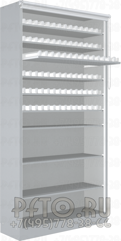 - Стеллаж сигаретный с рулонной шторкой с тремя пушерными полками