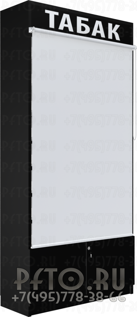 Шкаф с восемью уровнями полок и рулонной шторкой для электронных сигарет с тумбой под товар комплектуется пушерами с регулировкой по ширине. Изготавливается из плиты ЛДСП с торцевыми кромками ПВХ в цвет корпуса. Данную модель шкафа можно доукомплектовать светодиодной подсветкой и выдвижными полками.